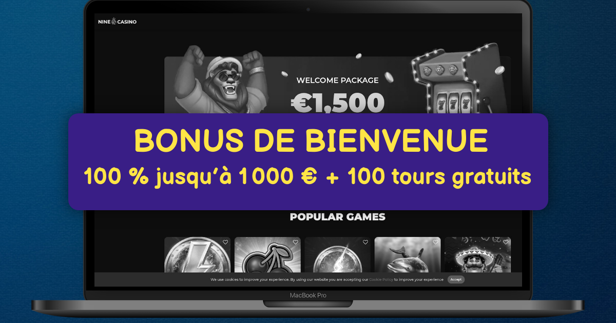 Nine Casino offre jusqu'à 450€ de bonus de bienvenue réparti sur les trois premiers dépôts, avec un dépôt minimum de 20€. Le bonus inclut également des tours gratuits et nécessite un rollover de 35x le montant du bonus.